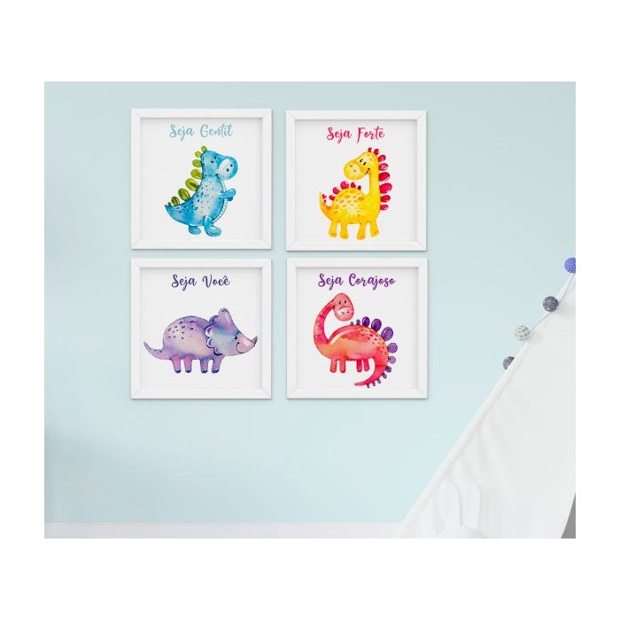 Kit Quadro Infantil Dinossauro Aquarela 4 Peças;