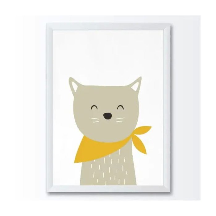 Quadro decorativo com moldura laqueada, Quadro infantil desenho gatinho cinza.