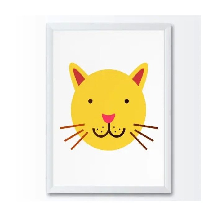 Quadro decorativo com moldura laqueada, Quadro infantil desenho gato amarelo.