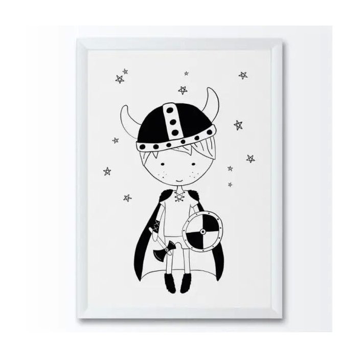Quadro decorativo com moldura laqueada, Quadro infantil desenho menino pequeno viking.