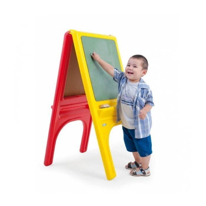 Com o quadro escolar xalingo a brincadeira pode ser em dose dupla. Tem um lado para cada criança, enquanto uma criança desenha com o giz a outra pode desenhar com as canetas para quadro branco. De um lado quadro verde para giz e do outro quadro branco para caneta wbm com prendedor de folhas para desenho. Acompanha apagador e giz para quadro verde.