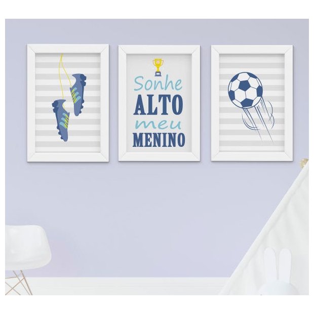 Quadro Infantil Menino Futebol Bola Sonhe Alto 3 Peças