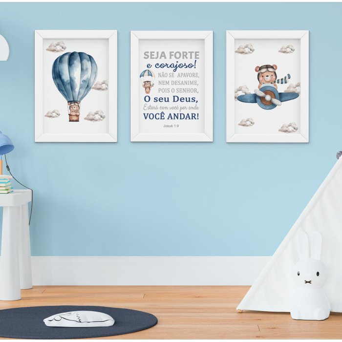 Quadro Infantil Menino Ursinho Aviador Seja Forte e Corajoso