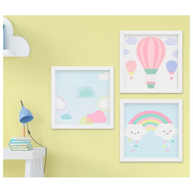 Quadro Infantil Quarto Bebê Menina Balão Nuvem Arco-Íris Kit 3 Peças