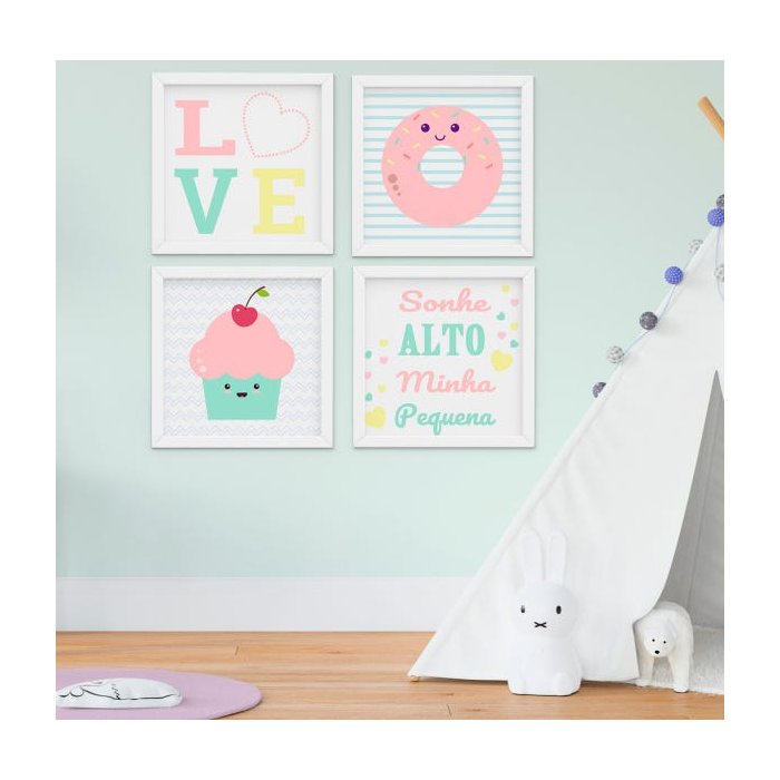 Detalhes do ProdutoQuadro Infantil Doces Kit com 4 Peças;Os Quadrinhos Bebê medem 23cm x 23cm ;Os Quadrinho Bebê possuem moldura branca;A moldura é feitas em mdf com 2cm de borda; Não acompanha vidro;