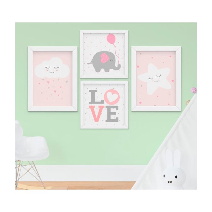 Quadro Infantil Quarto Bebê Menina Estrela Nuvem Elefante Kit 4 Peças