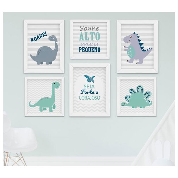 Quadro Infantil Quarto Bebê Menino Dinossauro Kit 6 Peças