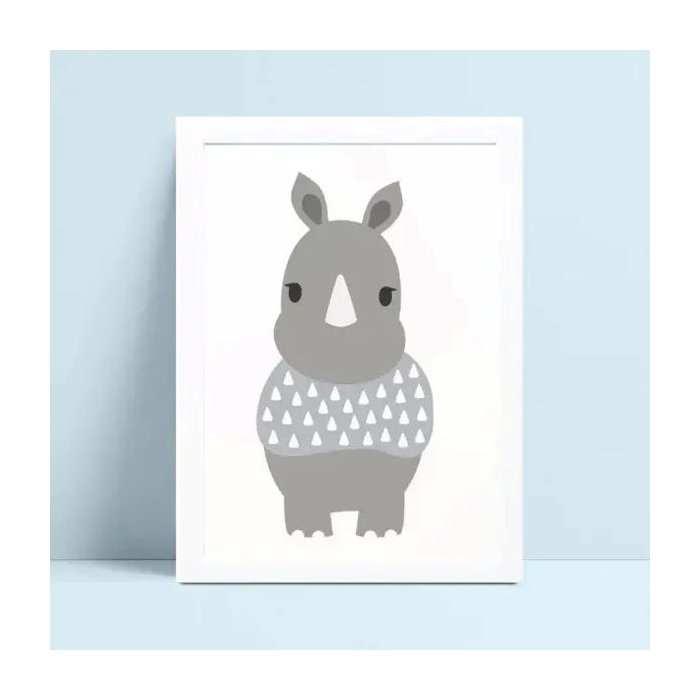 Quadro com moldura, Quadro infantil quarto bebê safári animal rinoceronte.