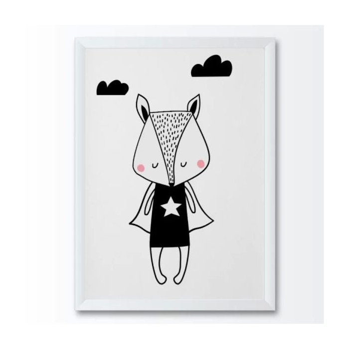 Quadro decorativo com moldura laqueada, Quadro infantil Raposa de Capa Super Herói.