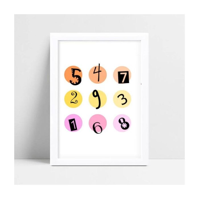 Quadro com moldura, Quadro infantil sem moldura círculo colorido números preto.