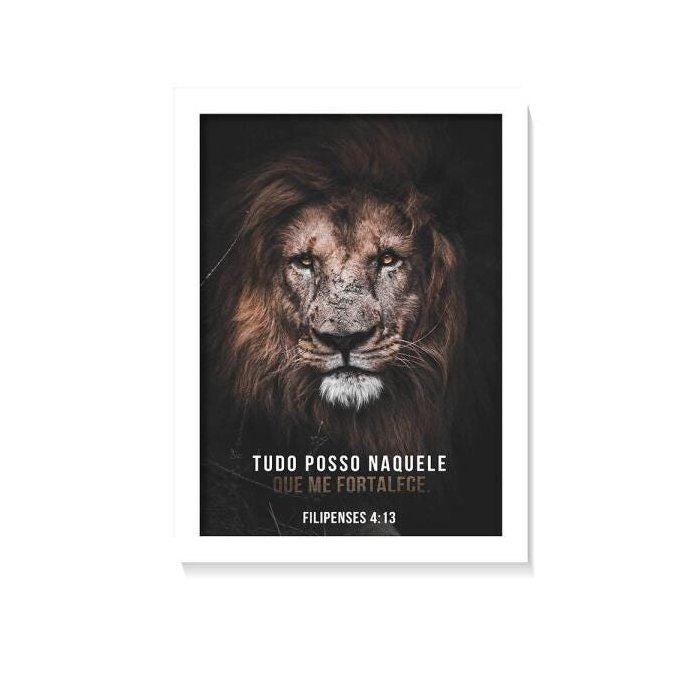 Quadro Decorativo Leão Tudo Posso Naquele Que Me Fortalece Moldura e Vidro Quarto Sala Cozinha