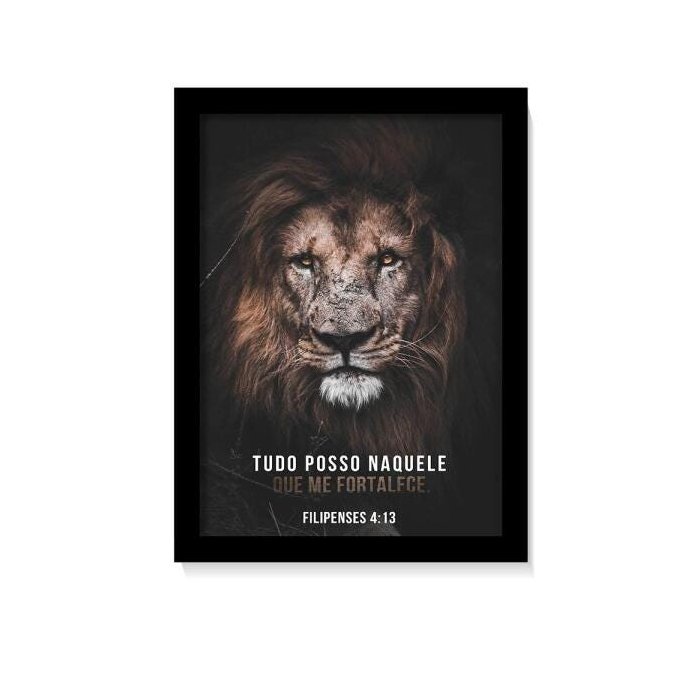 Quadro Decorativo Leão Tudo Posso Naquele Que Me Fortalece Moldura e Vidro Quarto Sala Cozinha