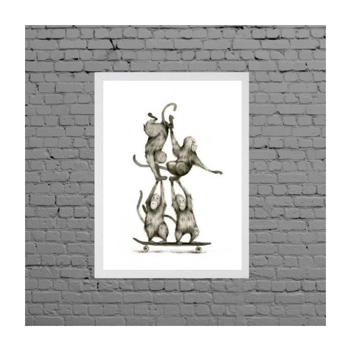 Quadro Macaquinhos No Skate 45x34cm - com vidro:Madeira preta