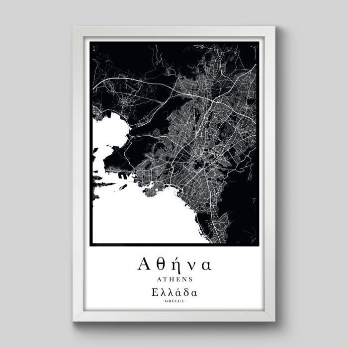 Quadro Mapa Atenas - 90x60cm - Moldura Caixa Branco