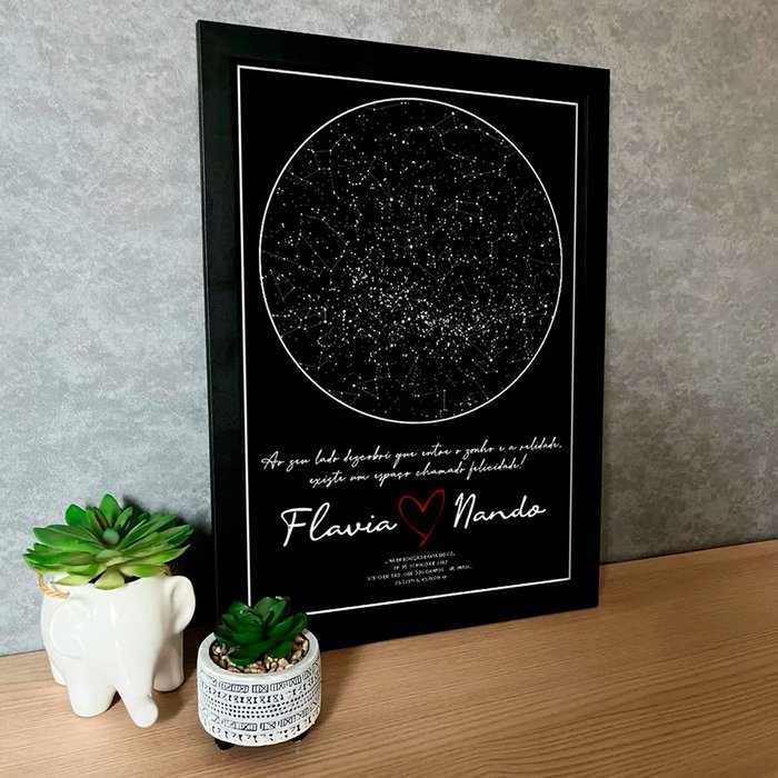 O Quadro Mapa das Estrelas vai mostrar exatamente o alinhamento das estrelas no lugar e hora escolhidos por você inclua também uma pequena Frase que preferir.. Pode ser qualquer data e qualquer lugar como o dia e hora do seu nascimento, o dia do seu casamento ou algum acontecimento especial, registraremos a localização exata das estrelas nesse momento em particular em um lindo quadro com moldura.