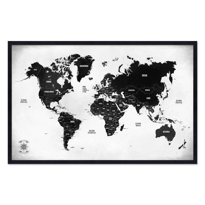 Quadro Mapa-Múndi Para Pinar Viagens com Alfinetes - 100x65cm - Preto e Branco - Moldura Preta