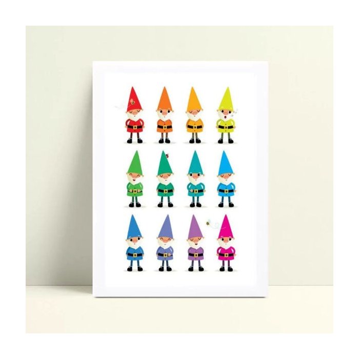 Quadro com moldura, Quadro menina menino jardim gnomos coloridos.