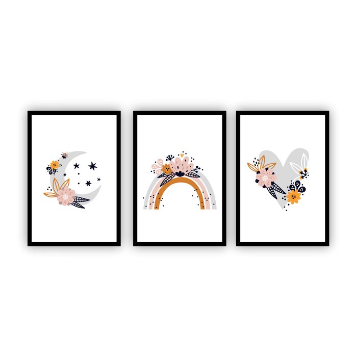 Quadro minimalista com moldura preta e vidro Lua Arco-íris Flores Coração Infantil
