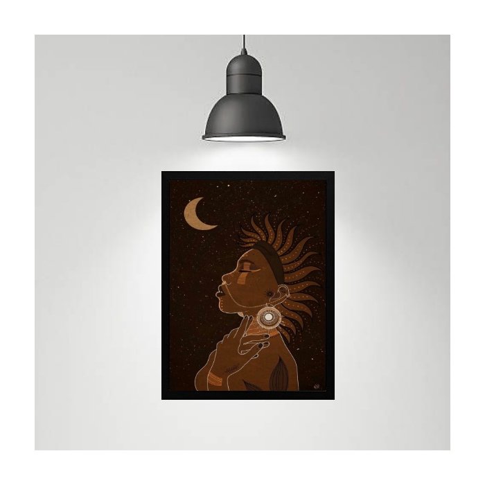 Quadro Místico Arte Índia Lua 33x24cm:madeira Preta