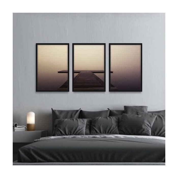 Quadro Mosaico Pier de Madeira Oceano Mistério Jogo 3 Peças Moldura Preta