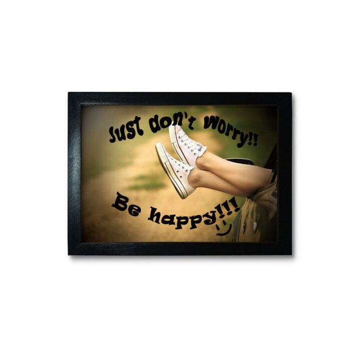 Quadro Decorativo Dont Worry (Não se preocupe), para ambientes fechados e cobertos. O produto vem com alça de alumínio para fixação, acabamento em madeira, imagem impressa com proteção em acrílico.