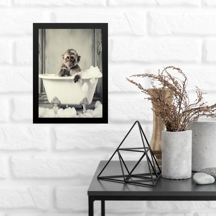 Quadro para Banheiro Macaquinho no Banho 45x34cm - com Vidro:moldura Preta