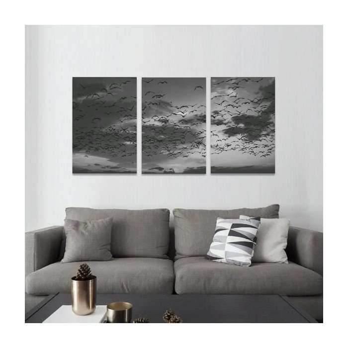 Quadro Pássaros No Céu Em Preto E Branco Em 3 Peças