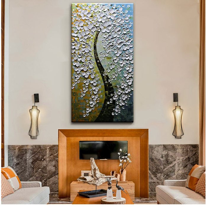 Quadro Pintura Tela brancas pêlas troncos pretos óleo 5446: 70cm (A) x 140cm (L)