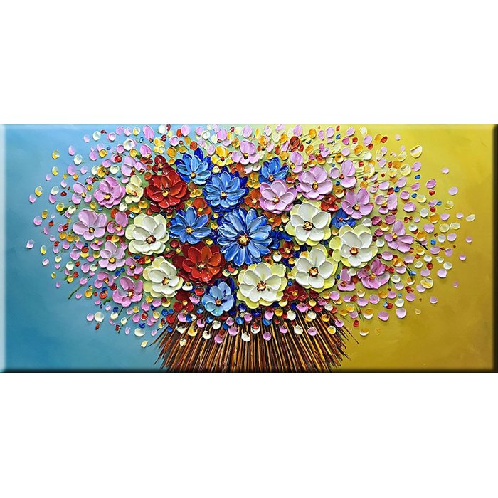 Quadro Pintura Tela fundo azul amarelo colorido buquê 5425: 70cm (A) x 140 cm (L)