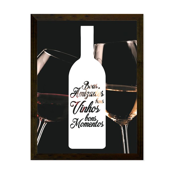 Conta com a moldura rustica pintada e o vidro na frente com silk com fundo em impressão a laser 170g, o tamanho externo dele é de 32x42cm.