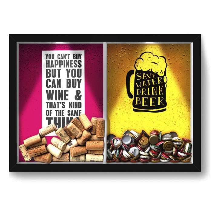 Deixe sua casa mais alegre, com melhor energia e estilo, design exclusivo NERDERIA E LOJARIA PRESENTES. Guarde as tampas de suas bebidas para lembrar dos melhores rotulos.Quadro caixa duplo porta tampinha cerveja e Rolha Vinho com iluminação de LEDcom medidas de 33 x 43cm, vidro frontal e furo superior.Quadro ficou cheio? Basta abrir o fundo removível e retirar as tampas. Quadro novo para ser utilizado novamente.Medida externa: 43x33cm. Impressão de alta qualidade, imagem no fundo do quadro e acabamento lateral interno em foam board branco (não é pintado).Moldura de madeira laqueada e pintada com acabamento faceado para garantir a qualidade e resistência do produto.Conjunto LED branco bivolt (110V e220V) com fonte inclusa. Pode ser pendurado com fita dupla face conforme orientação do fabricante ( inserir 2 tiras nos estremos da traseira das molduras inferior e superior) , prego aço e ou parafuso.Consulte em nossa loja virtual os serviços de instalação, basta entrar em contato via whatapp e agendar o serviço. Atendimento restrito para a grande São Paulo e região. Podem ocorrer pequenas variações de cor, brilho e tamanho.