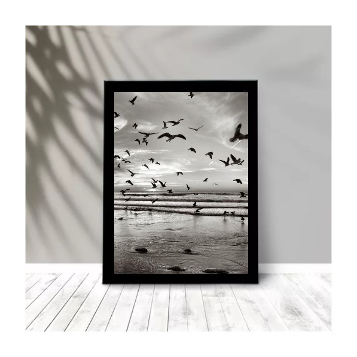 Quadro Praia Preto e Branco - Pássaros 33x24cm - com Vidro:moldura Preta