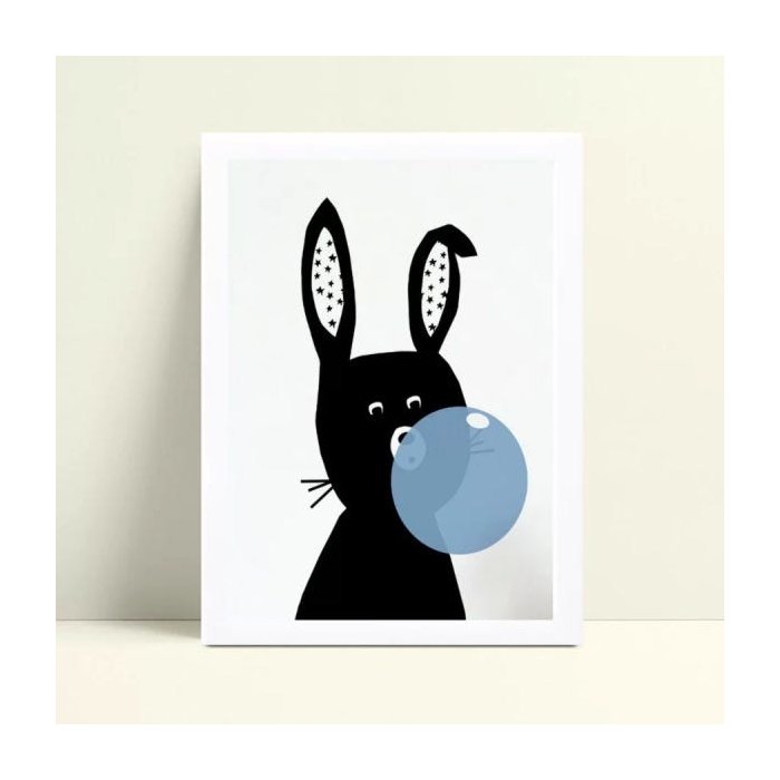 Quadro com moldura, quadro quadro infantil coelho preto chiclete azul.