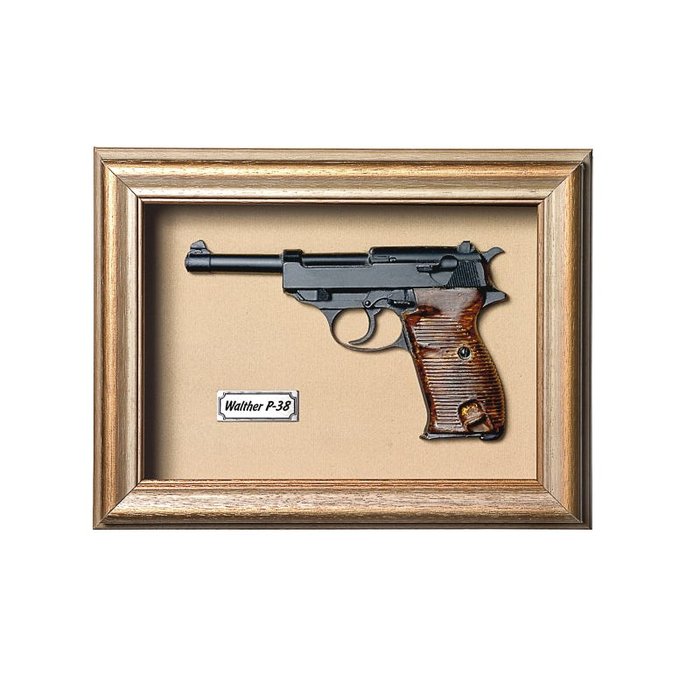 Quadro réplica de arma com moldura clássica e fundo bege. Peça com sofisticada moldura de madeira, acondicionada em vidro, fundo de camurça e plaqueta metálica prata Inox de identificação da arma. Essa é uma peça extremamente realista(tamanho 1/1), com excelente qualidade e bom gosto. É um lindo presente e peça para decoração e para coleção, amantes de armas e gamers. É uma peça para presentear, um verdadeiro presente para ser lembrado.