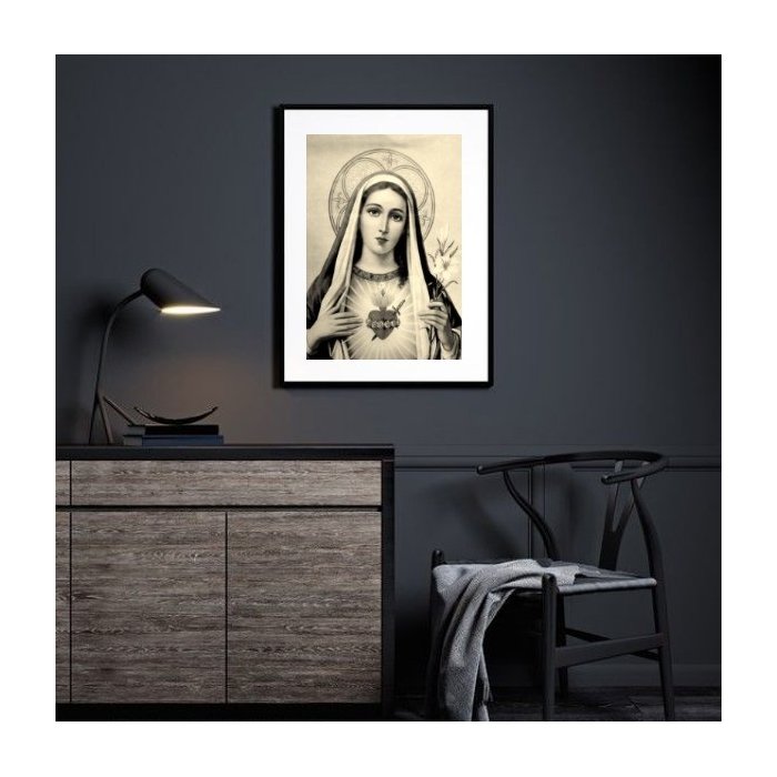 Quadro Sagrado Coração de Maria Preto e Branco - 60x48cm:madeira Branca
