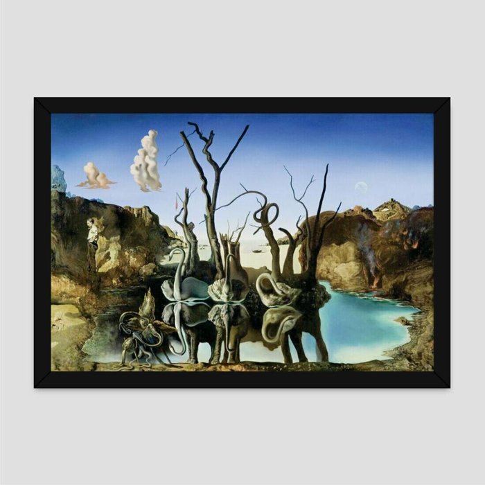 Quadro Salvador Dali Cisnes Refletindo Elefantes Vinil Moldura Preta 30X20Cm