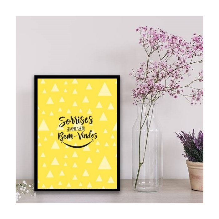 Quadro Sorrisos Sempre Serão Bem Vindos 24x18cm - com vidro:Madeira branca branca