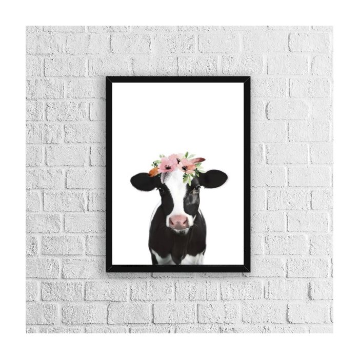 Quadro Vaca Flores 45x34cm - com vidro:Madeira preta