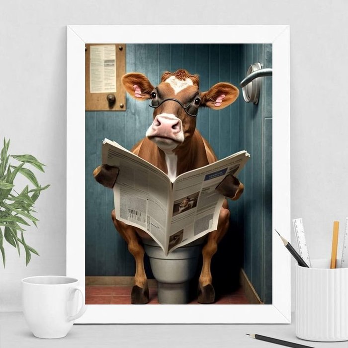 Quadro Vaca no Banheiro Lendo jornal 24x18cm:madeira Preta