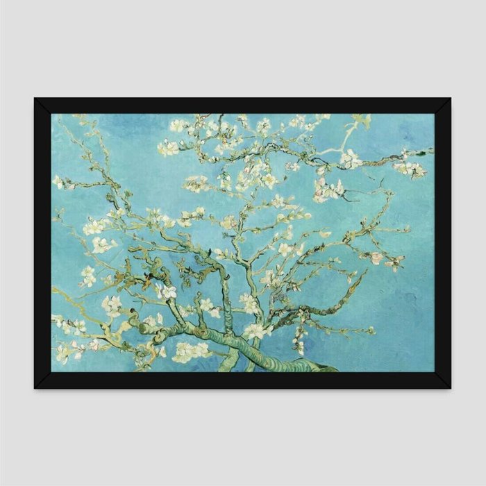 Quadro Van Gogh Amendoeira Em Flor Vinil Moldura Preta 45X30Cm Azul
