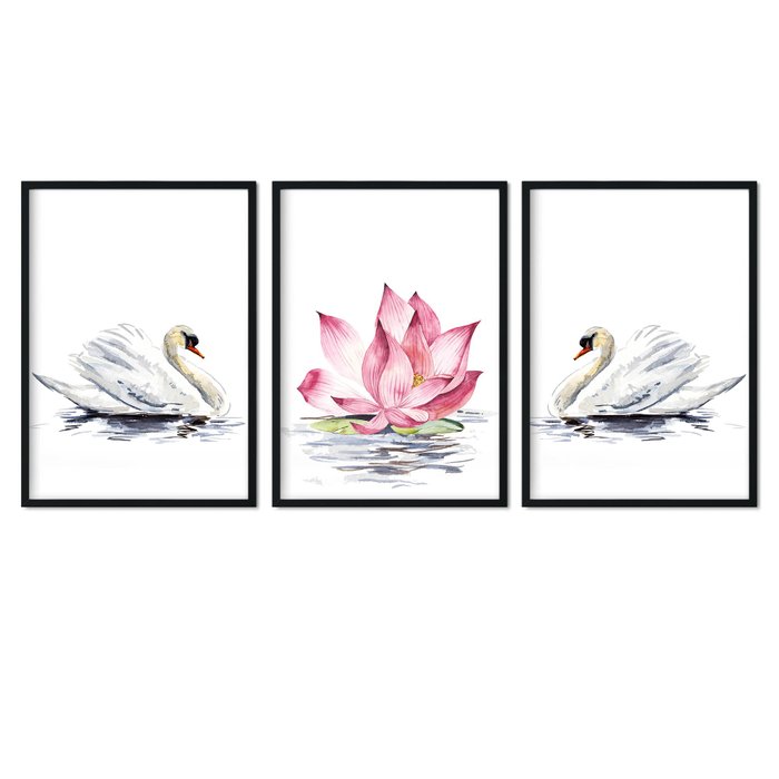 Quadro Vidro Kit 3 Cisne Flor de Lótus Pintura Desenho Natureza Sala Quarto