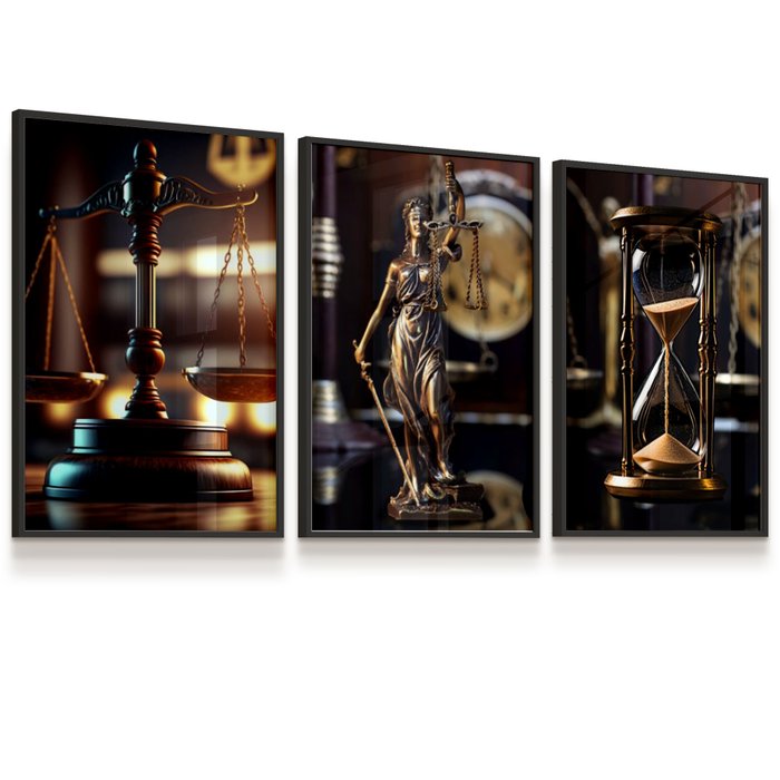 Quadro Vidro Kit 3 Direito Advocacia Deusa Balança Ampulheta 109x43