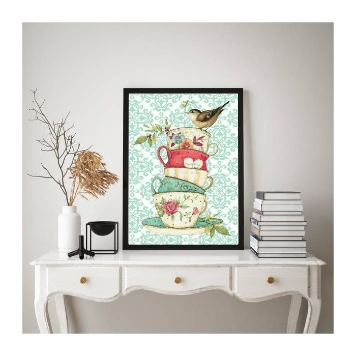 Quadro Vintage Cozinha Xícaras com Passarinho 33x24cm - com Vidro:madeira Branca Branca