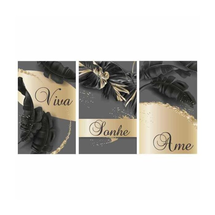 Quadro Viva Sonhe e Ame Cinza Preto e Dourado - Kit 3 telas - 150 x 100 cm - Preta