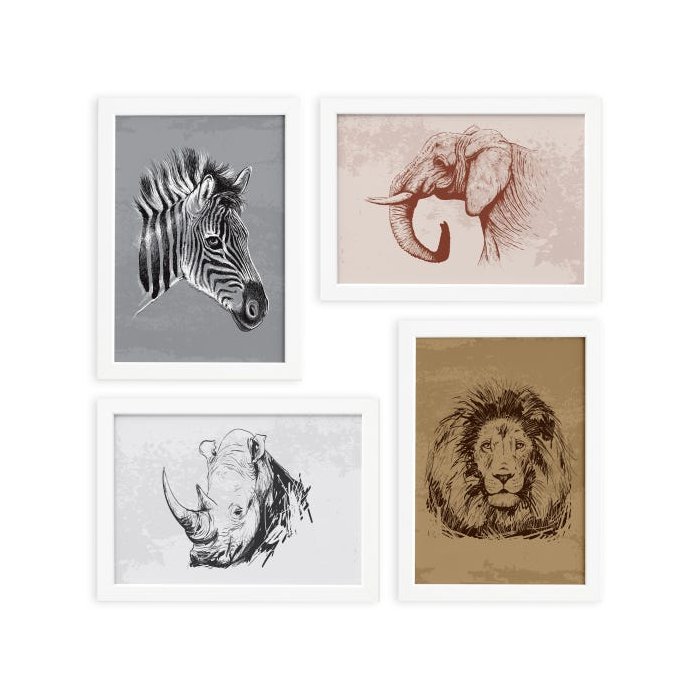 Quadros Animais Safari África Moldura Branca 22x32cm 4un