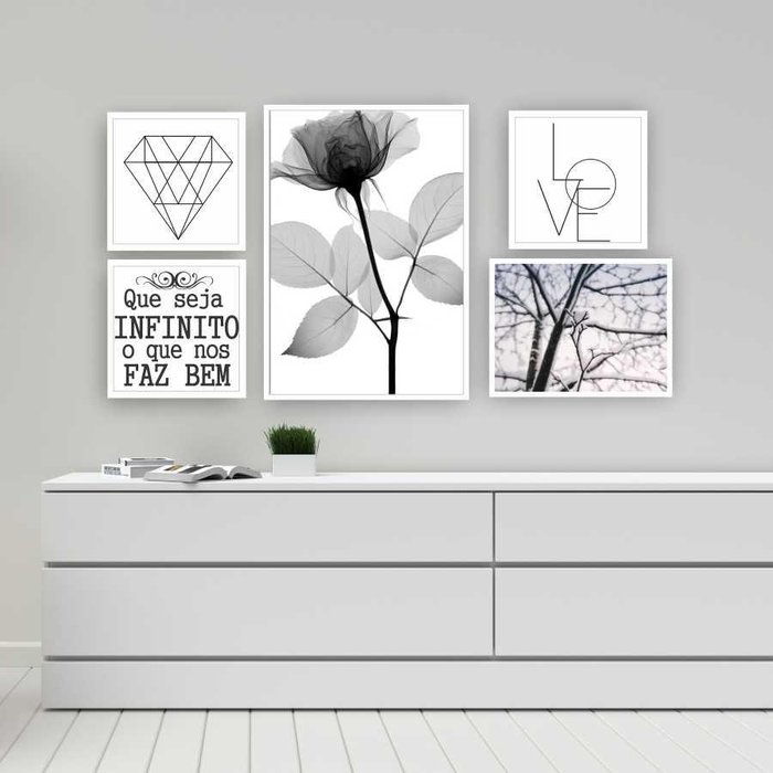 Quadros Decorativos Composição 09 Moldura Branca. Acabamento Moldura Branca. Material: Quadrinho Adesivo. Referência: QDCOMP9-Moldura Branca. Imagem impressa no adesivo com proteção vinílica que possibilita limpeza com álcool ou pano úmido. Moldura de madeira reta e lisa com 2 cm de largura. O verso do quadrinho possui acabamento selado e pendurador . Não possui vidro.