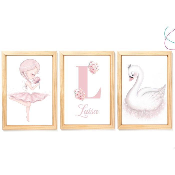 Quadros decoração quarto menina Bailarina e Cisne com vidro:Pinus