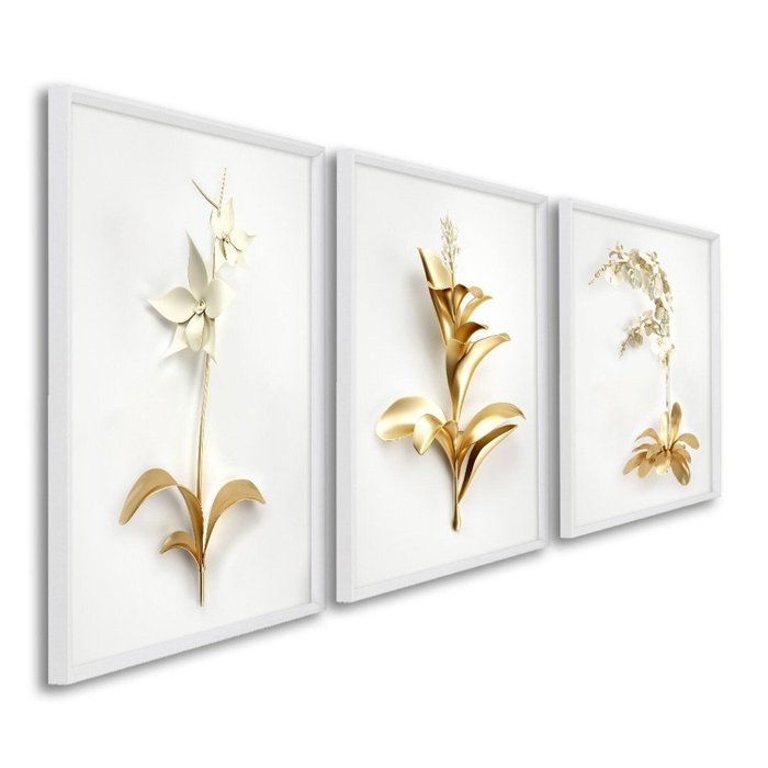 Quadro Decorativo Floral Delicado Flores Brancas e Douradas com 3 Telas para Sala, Quarto, Banheiro, Escritório, Hall, Hall de Entrada, Estúdio, Salão, Clínica.