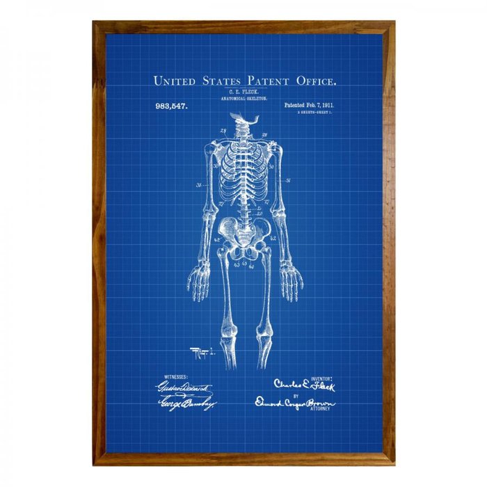 Transforme seu ambiente com Quadros decorativos Patente Azul esqueleto anatômico simples.
