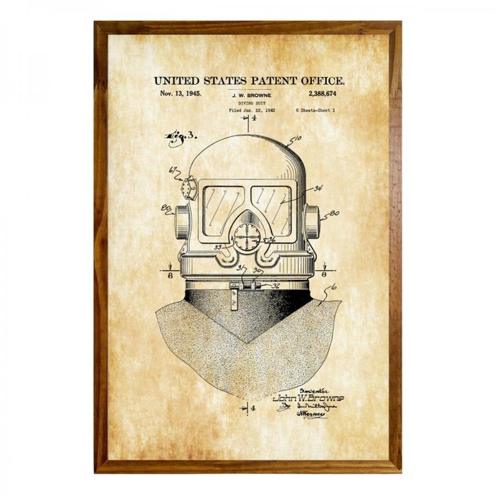 Transforme seu ambiente com Quadros decorativos Patente vintage capacete traje de mergulho.